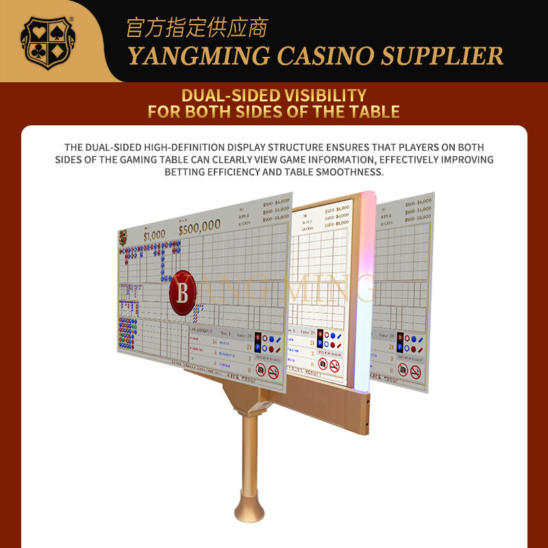 Affichage du casinoIl dispose d'un éclairage LED lumineux et d'un design moderne et mince, assurant une visibilité claire des deux côtés de l'écran.TableauConçu pour un fonctionnement continu du casino, il offre des performances stables, des graphismes vifs et de larges angles de vision.affichage multilingue, et le logo de marque pour améliorer l'efficacité de la gestion du jeu et la présentation globale du casino.